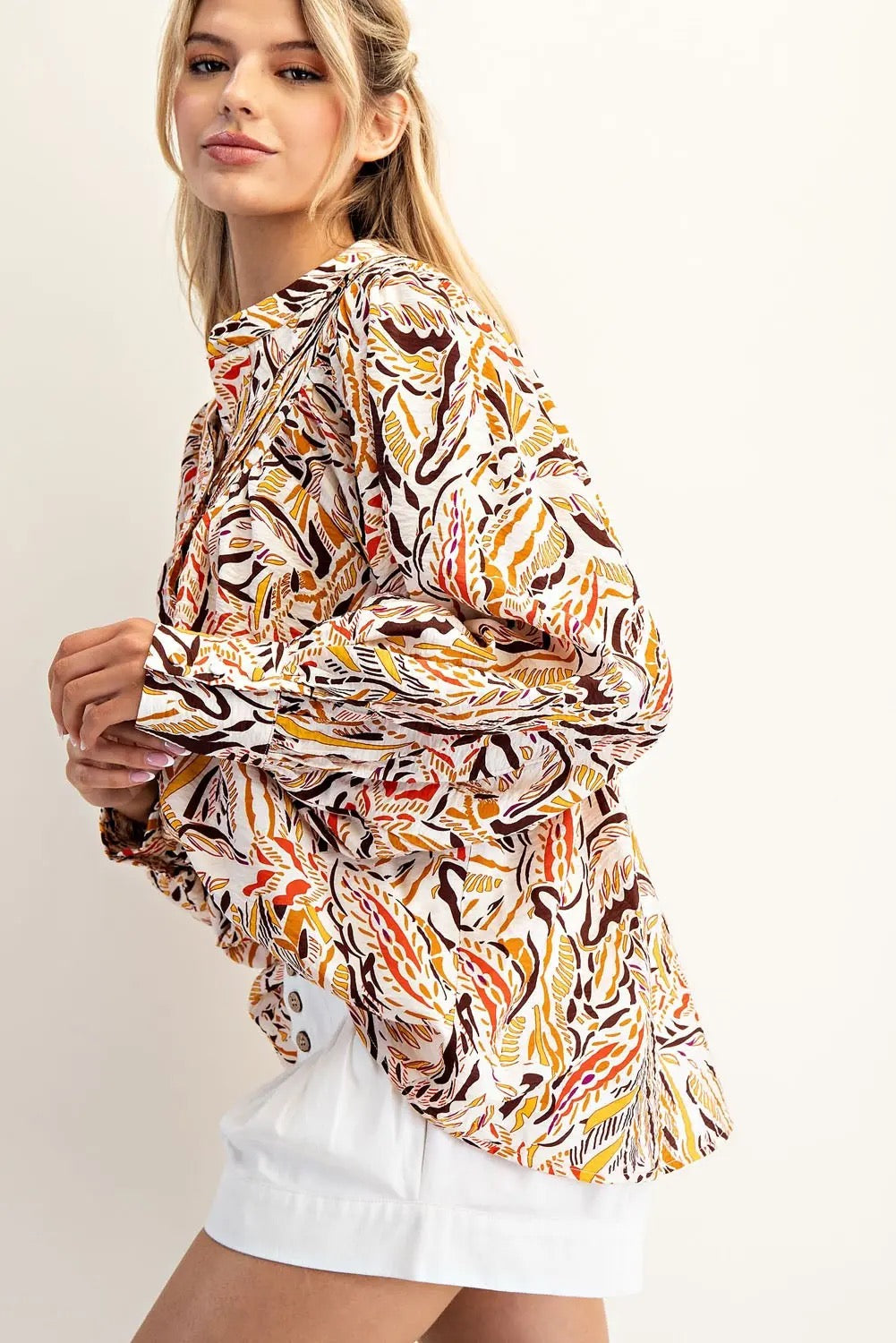 Check out this printed button down long sleeve top.