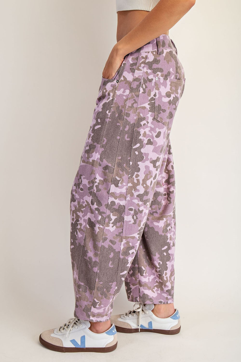 These soft washed barrel pants feature a bold camo inspired print, exaggerated panel seam detailing, classic five pocket styling, and belt loops with a button and zipper closure for a utilitarian cool silhouette.