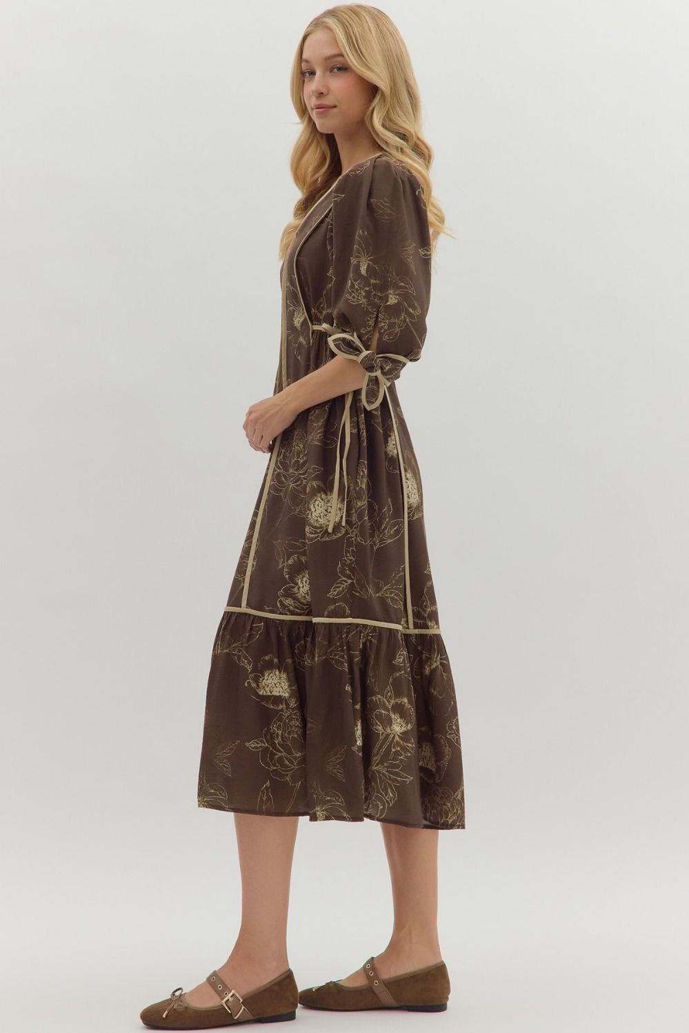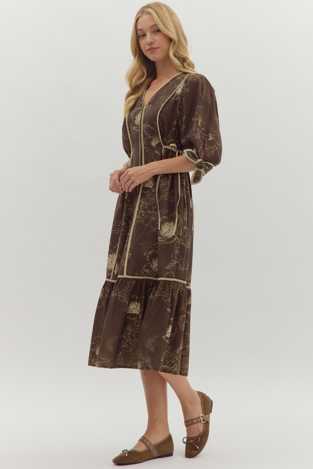 Botanical print 3/4 sleeve midi dress featuring contrast binding detail and self-tie accents at sides and cuffs. V-neckline. Ruffle hem. Side pockets. Lined. Woven. Non-sheer. Lightweight.