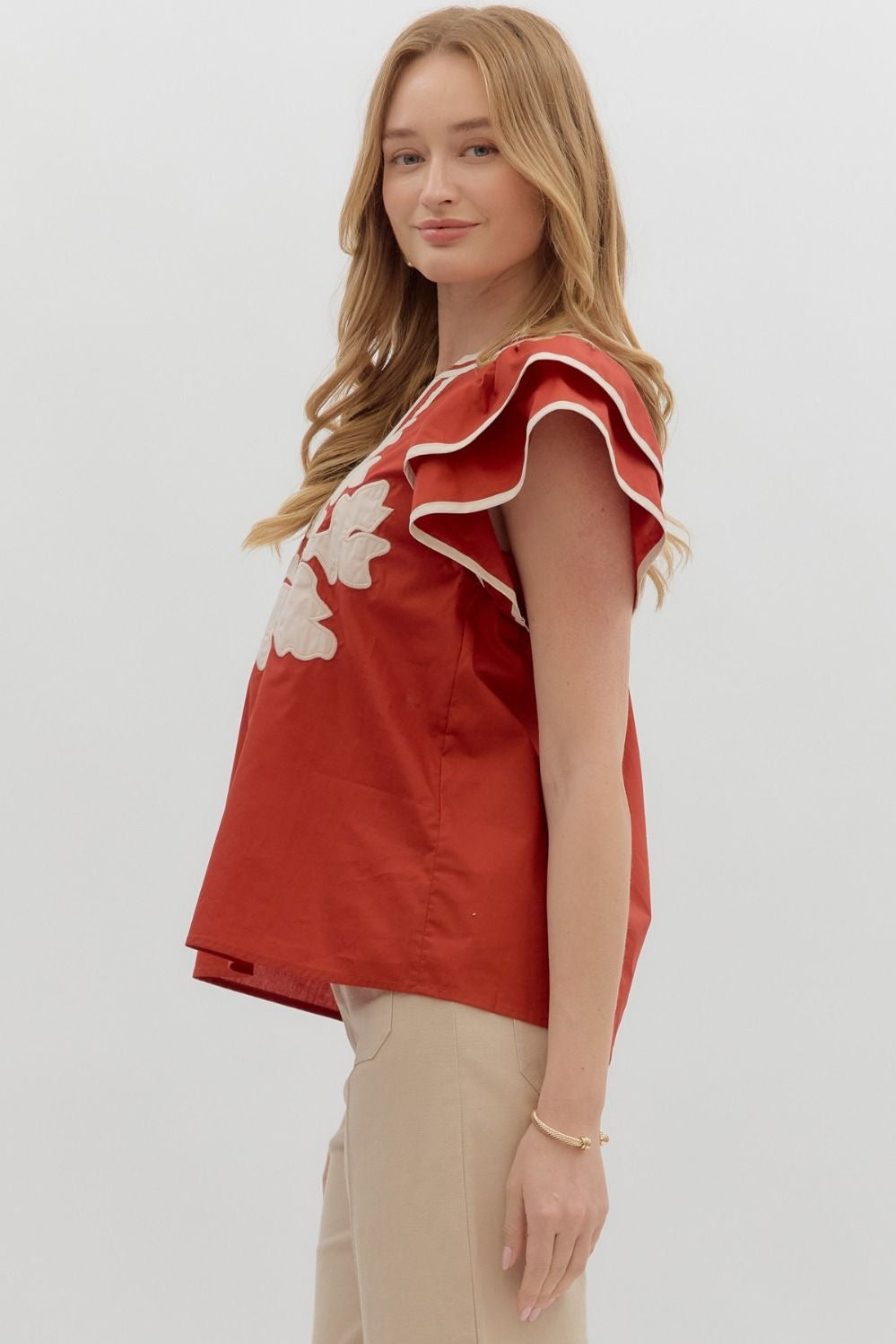 Solid flutter sleeve mutlicolor accent V-neck top featuring embroidered applique at front. Unlined. Woven. Non-sheer. Lightweight.