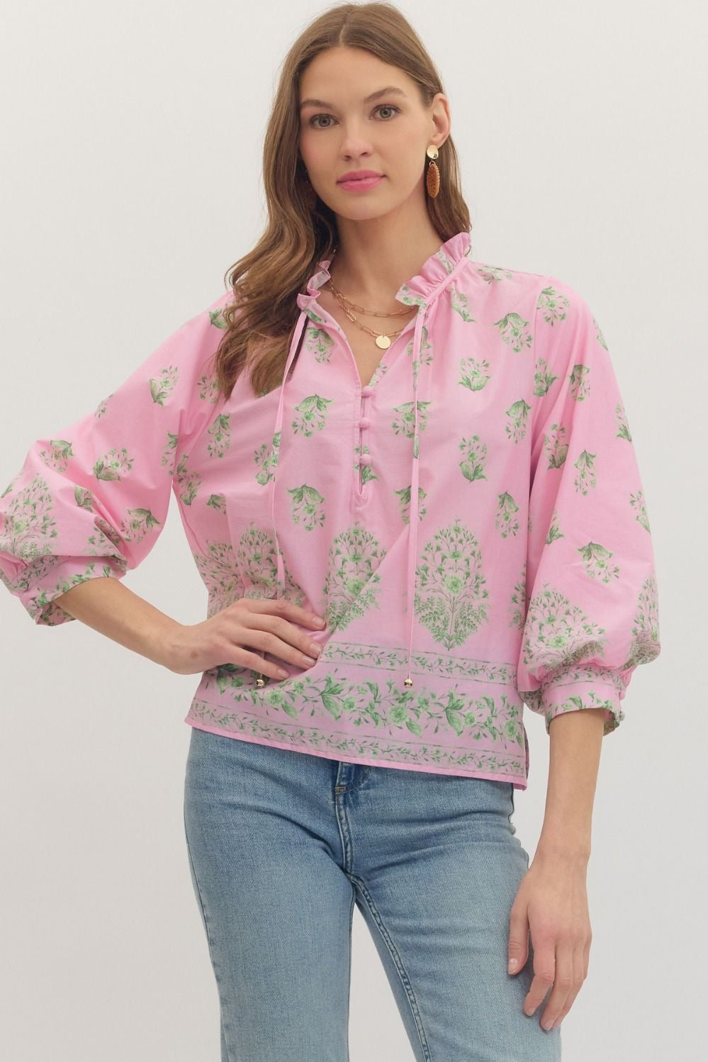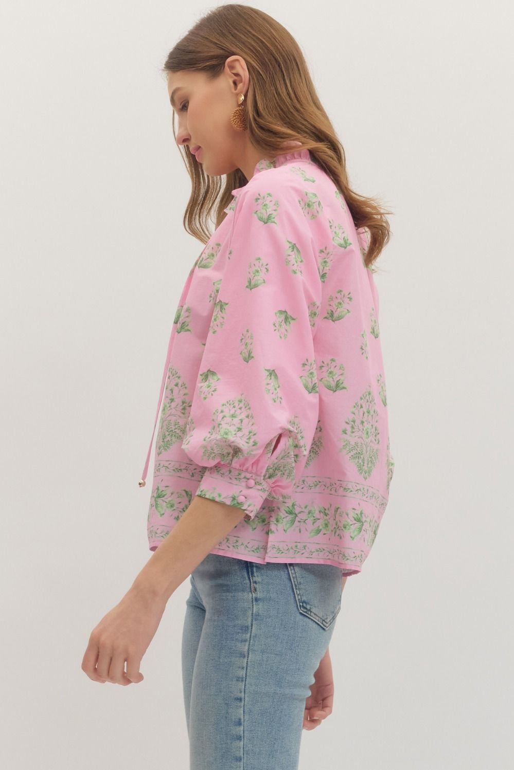 Botanical print balloon 3/4 sleeve top featuring ruffle split neckline with button placket. Button closure at cuff. Unlined. Woven. Non-sheer. Lightweight.