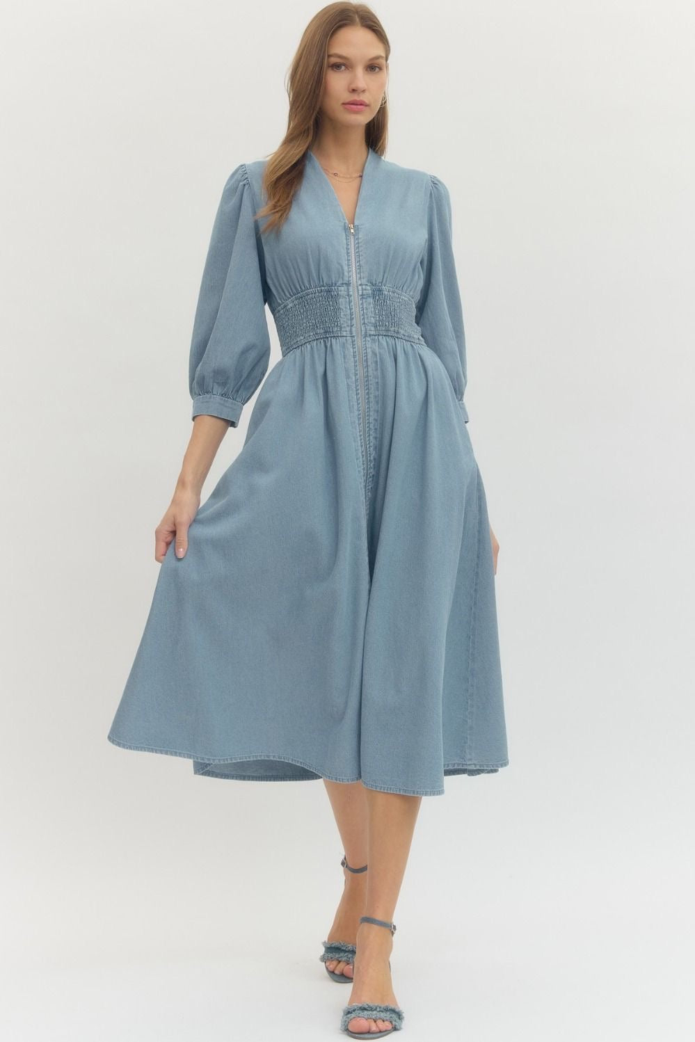 Solid denim 3/4 sleeve midi dress featuring smocked waist detail. Zip closure at front. Side pockets. Unlined. Woven. Non-sheer. Lightweight.