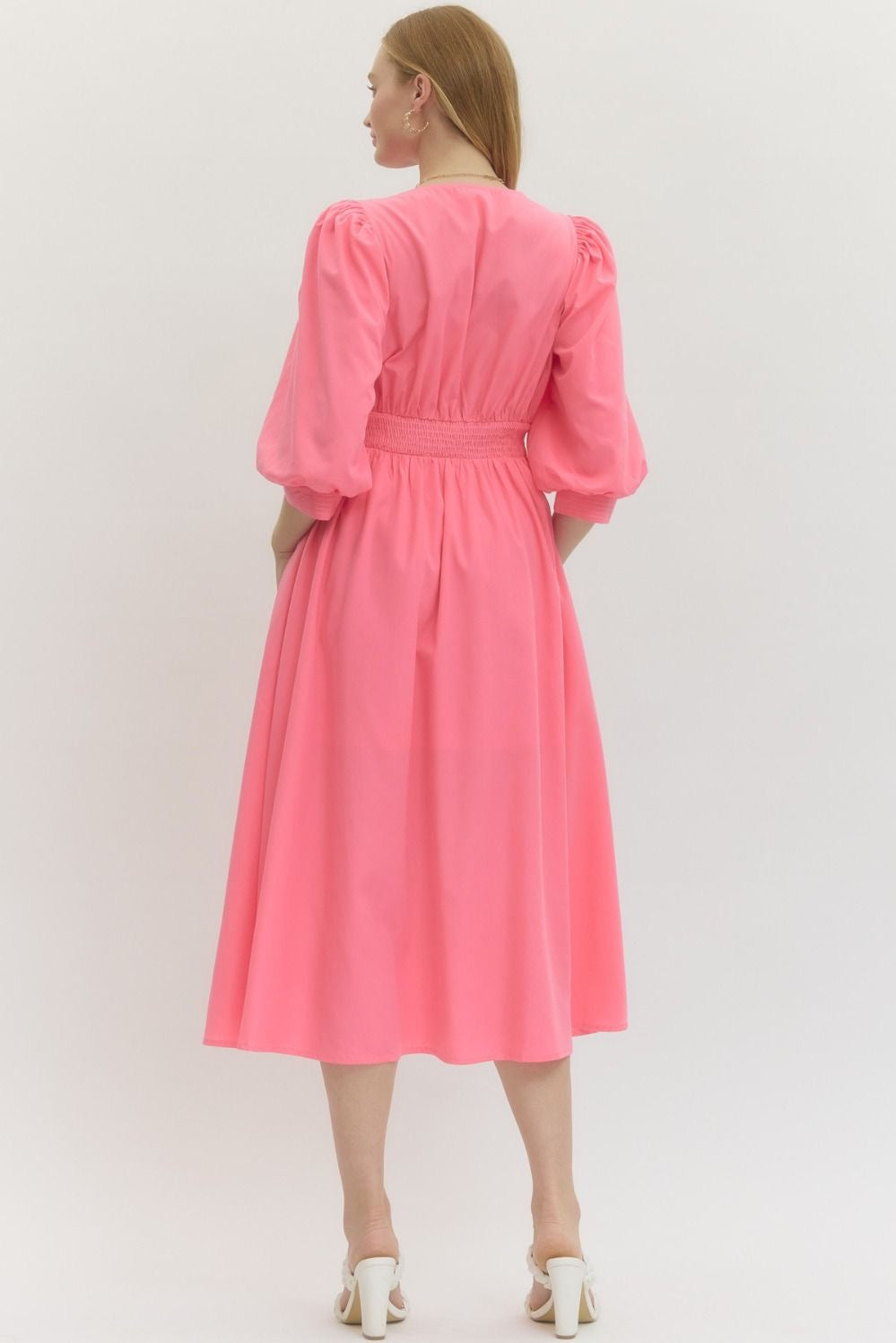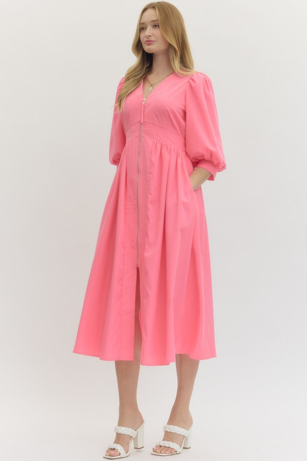 Solid ¾ sleeve midi dress featuring smocked waistband. Zipper closure at front. Side pockets. Lined. Woven. Non-sheer. Lightweight.