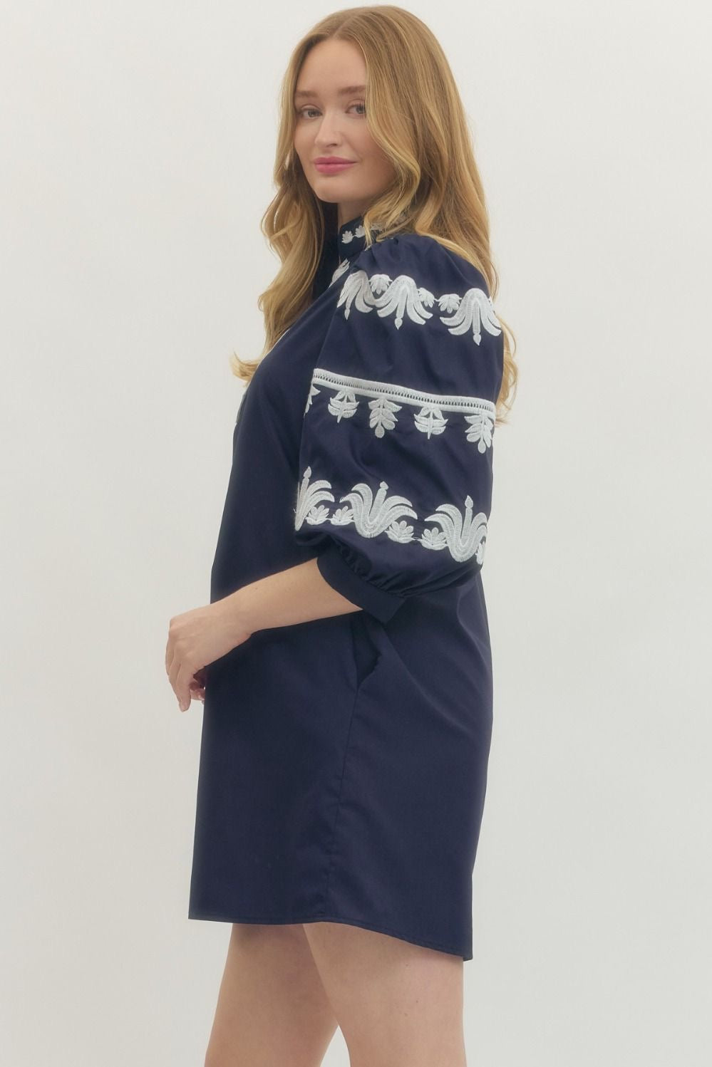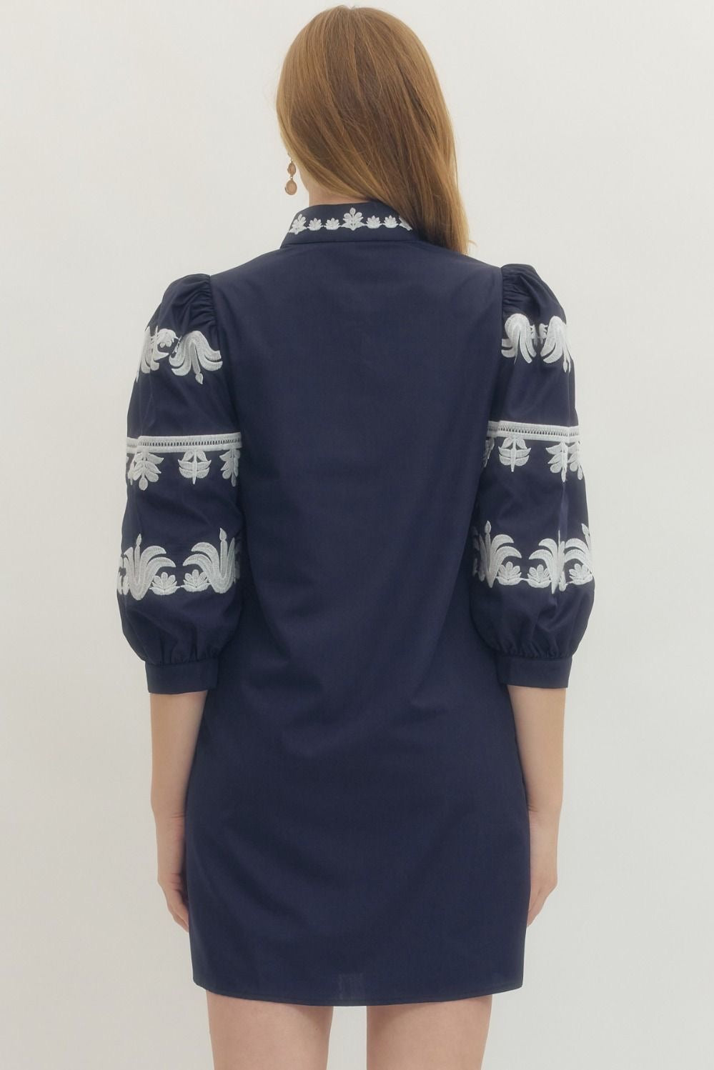 Solid 3/4 puff sleeve mini dress with gathered sleeve openings featuring contrast embroidery along split neckline, collar and sleeves. Side pockets. Lined. Woven. Non-sheer. Lightweight.