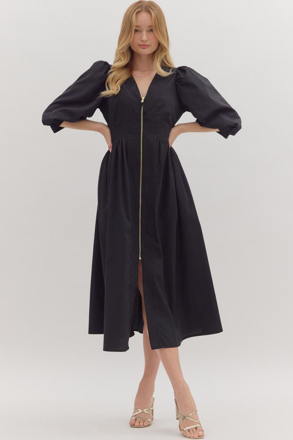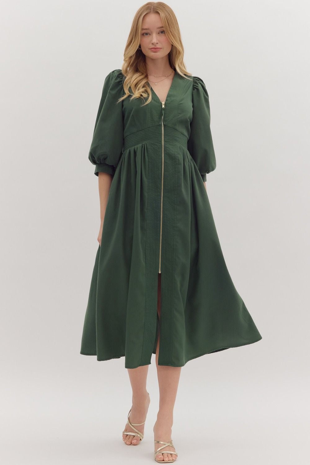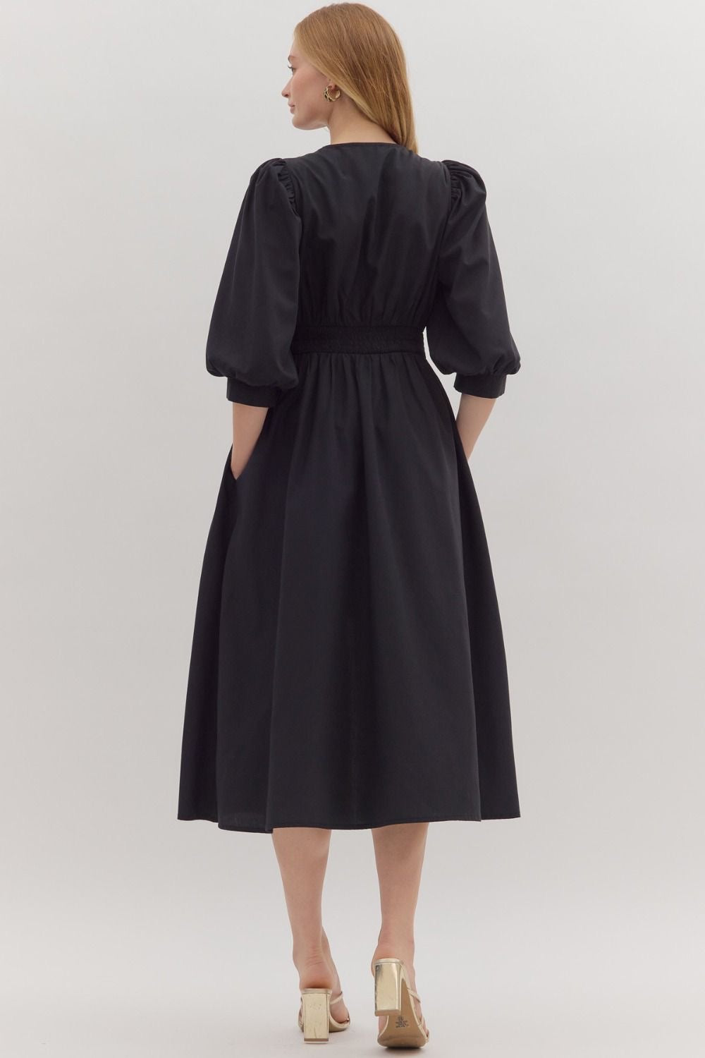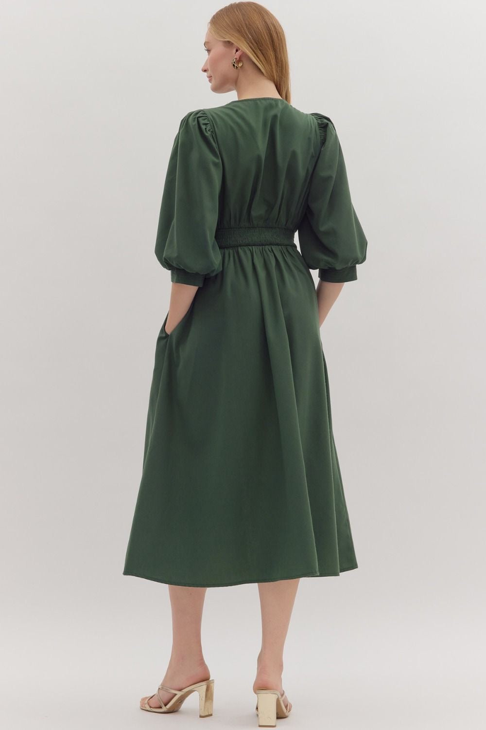 Solid ¾ sleeve midi dress featuring smocked waistband. Zipper closure at front. Side pockets. Lined. Woven. Non-sheer. Lightweight.