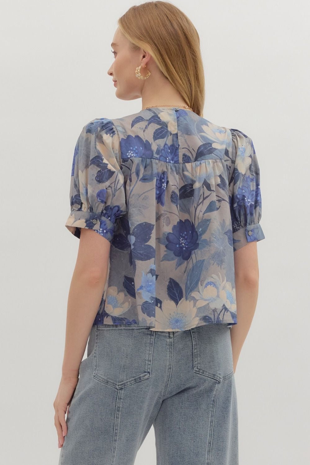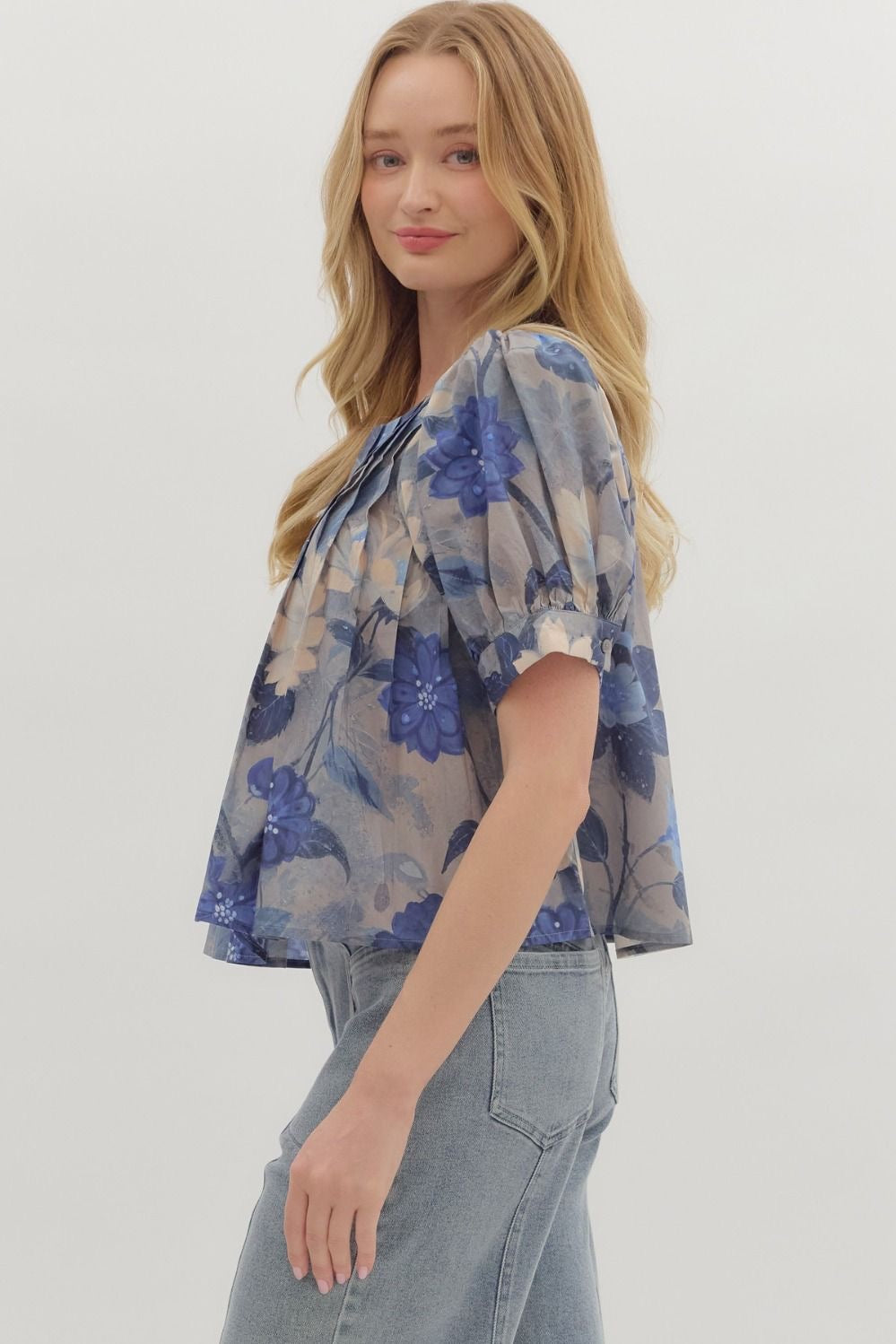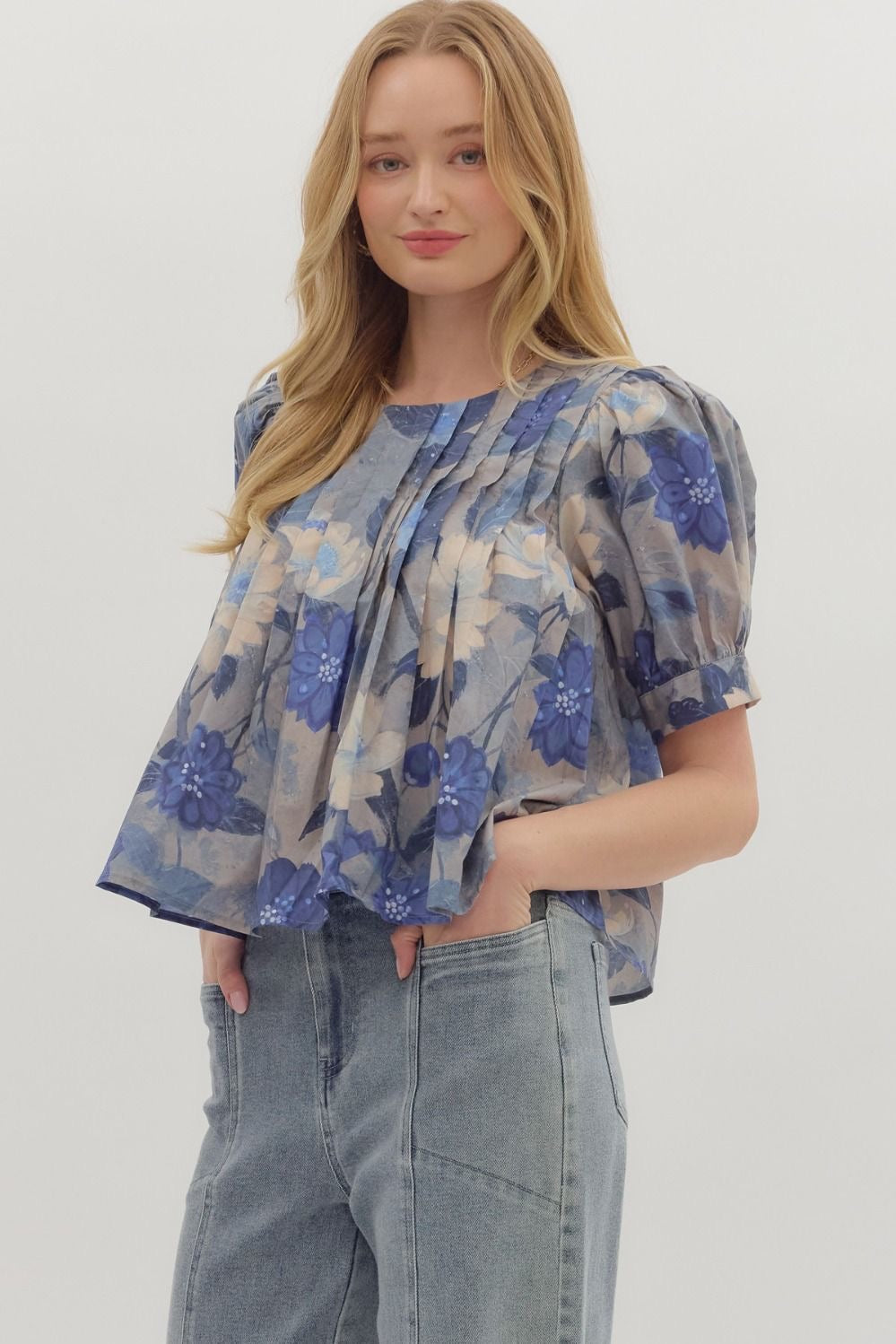 Floral print short puff sleeve pleated top. Single button keyhole at back. Unlined. Woven. Non-sheer. Lightweight.