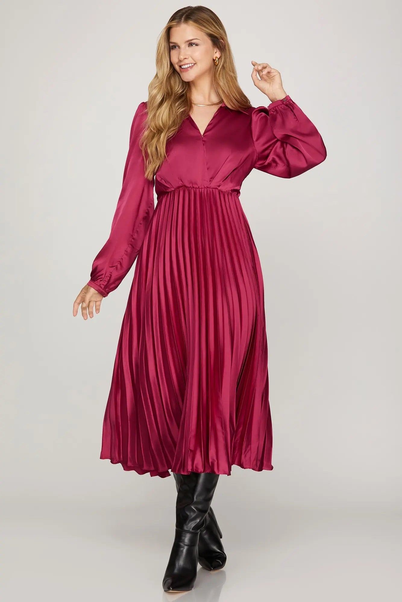 Check out this adorable surplice long sleeve woven satin pleated midi dress.