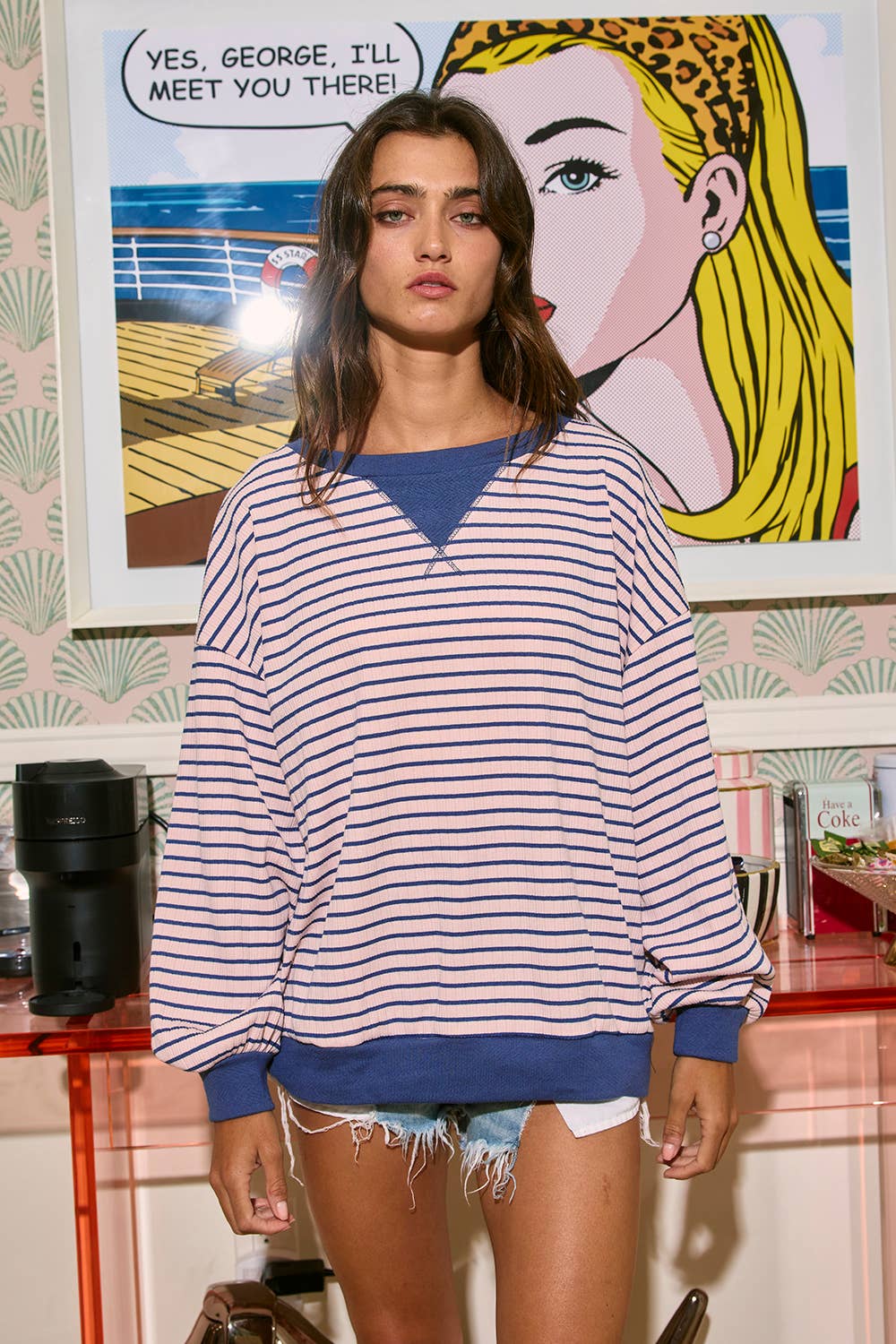 Contrast Ribbed Details Striped Sweatshirt Top - Boat neck - Long drop-shoulder sleeves - Revers stitch detail - Oversize fit