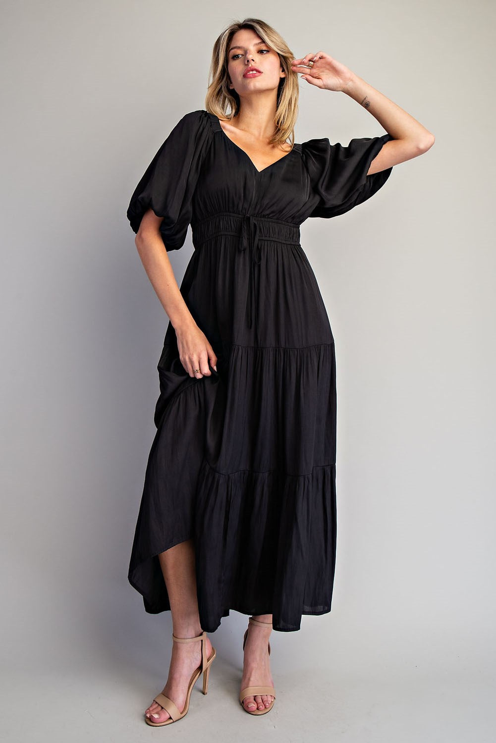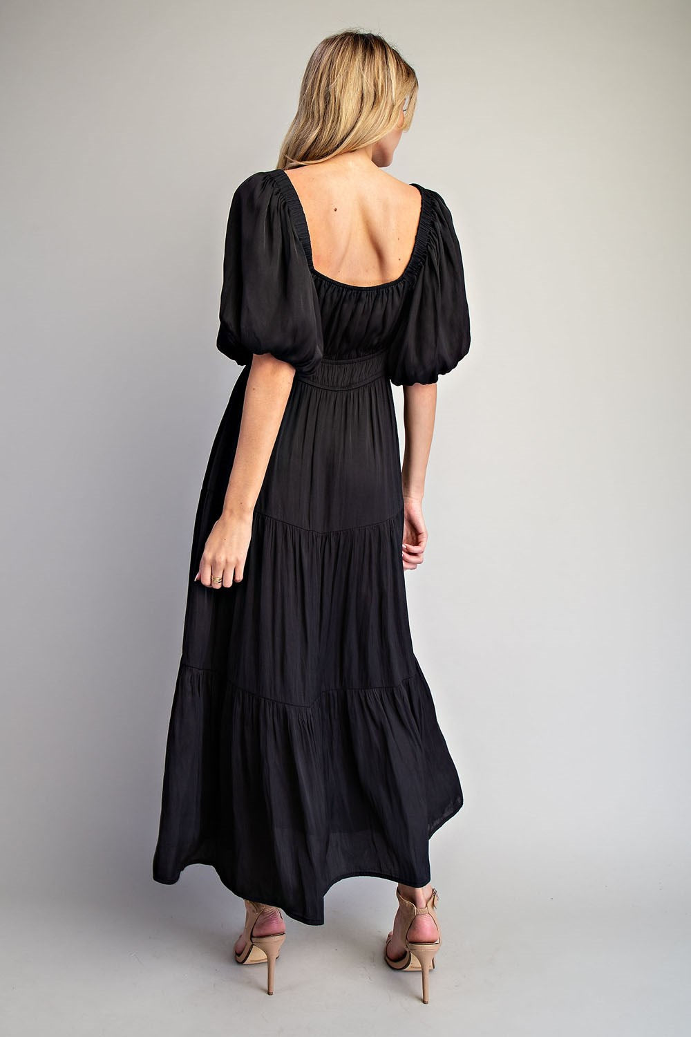 Check out this adorable puff sleeve elastic waist tiered maxi dress.