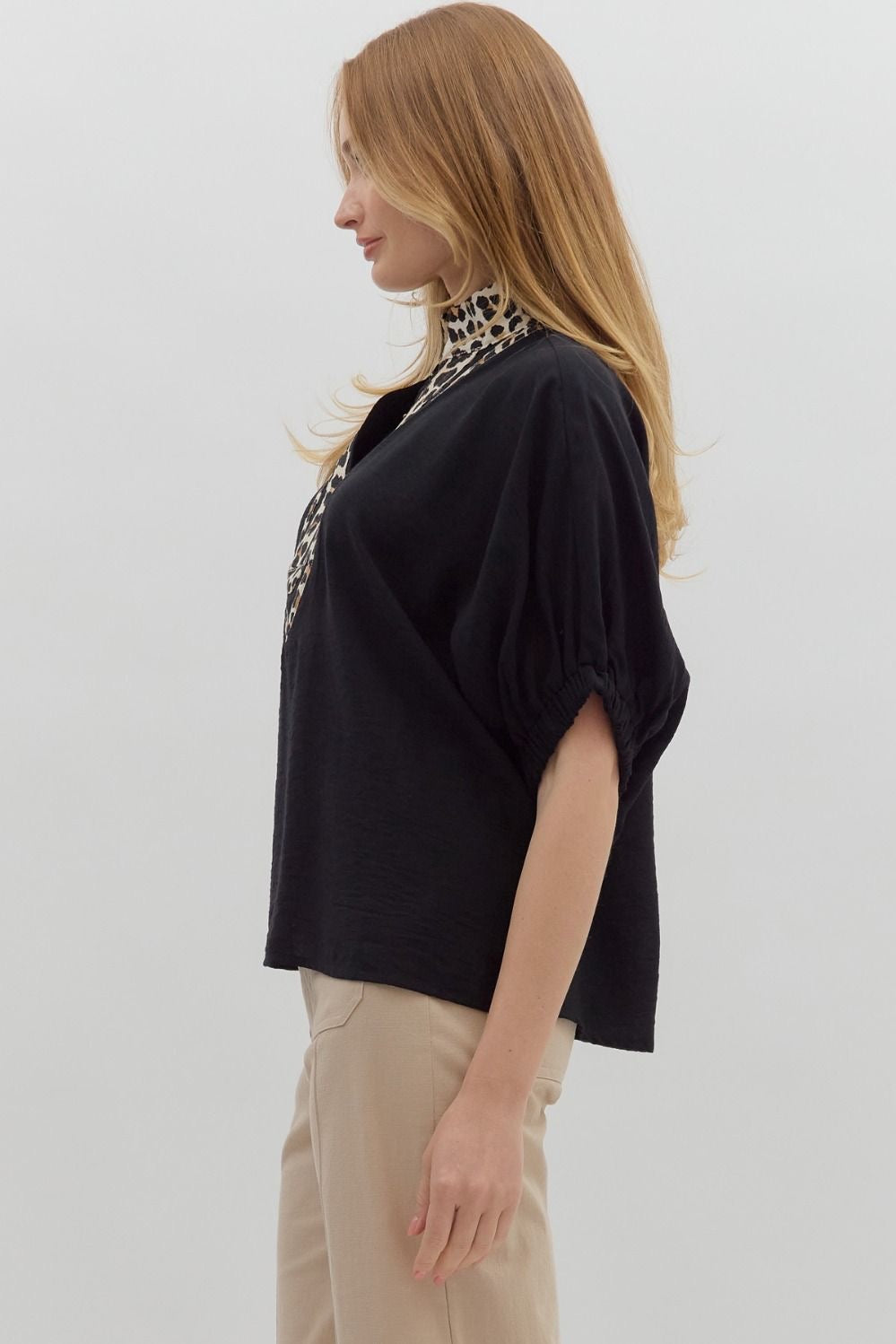 Solid elasticated sleeve band dolman top featuring leopard print accented caftan-inspired split neck placket. Unlined. Woven. Non-sheer. Lightweight.