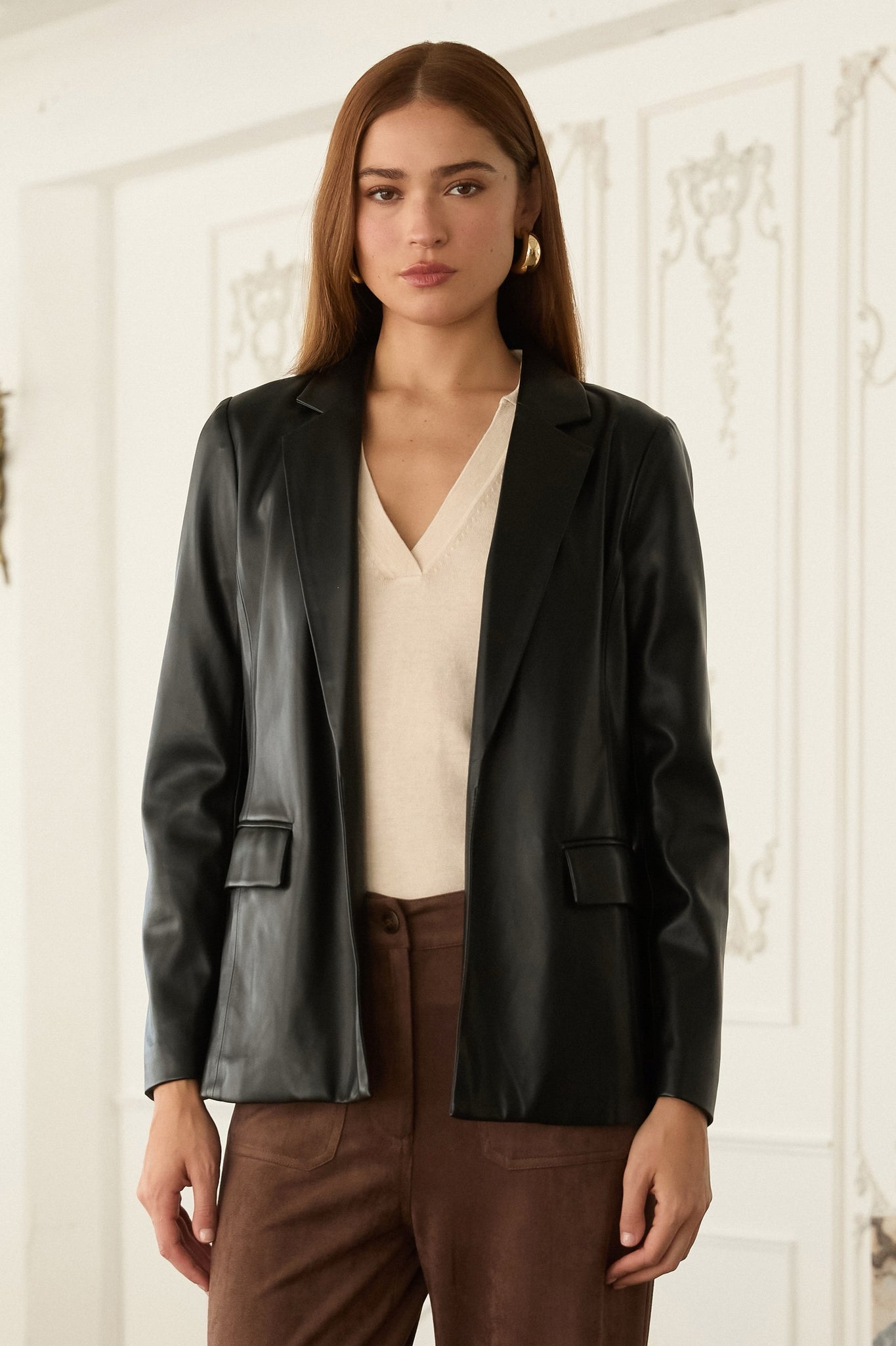 Sleek and modern, this open-front blazer is crafted from supple faux leather for an effortlessly chic look. Designed with a clean silhouette, it adds just the right amount of edge to both casual and polished outfits.